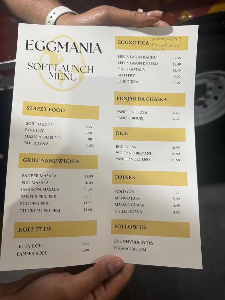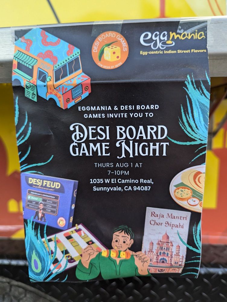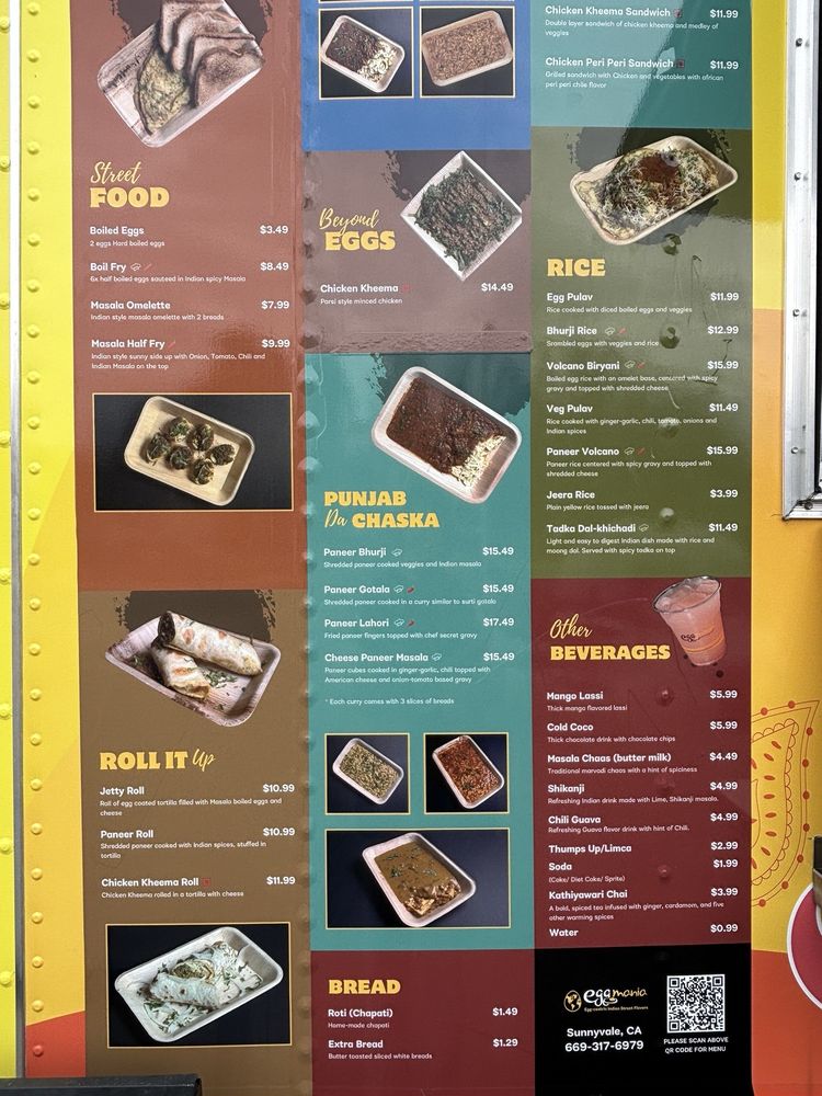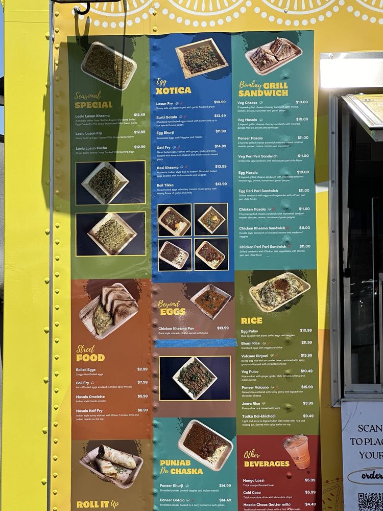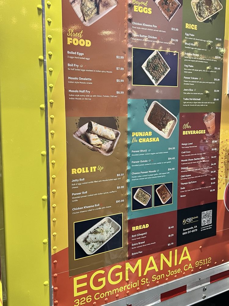 “ Eggmania is a popular food truck in Sunnyvale, specializing in Indian street-style, egg themed dishes. It's located near other food trucks in the area (Everest Momo) and is close by the Indian grocery store, Apni Mandi. This business accepts Apple Pay as well. The owners are super nice and involved with their customer base. They were having a game night collaboration with owners of desi created board game group as a way to engage the community. The creators of the board games advertised and encouraged customers to play Desi Feud (a twist on family feud) and Raja Manthri Chor Siphai. Additionally, the food truck was well decorated and relatively neat inside. There's a few tables to eat on outdoors but are mostly used to play board games as well. Parking in the area is relatively easy as there's many lots nearby the food truck too. The food itself was flavorful and packed with heat. We ordered 2 popular dishes which were highly recommended by the owner and the chili guava beverage. The egg peri peri sandwich was an 8/10 - it was pressed well, there was a good ratio of filling to bread, and the flavor was balanced with the eggs. The Leela Lasun Keema wasn't my favorite but it is highly rated. The shredded egg curry was spicy, served with 3 buttery slices of toasted white walmart bread - I'd rate it a 5.5/10. The chili guava drink was refreshing and is comparable to hajmola flavored pani puri water. You get a free salted brownie bite by reviewing on Google/Yelp and 10% off your next order if you follow them on Insta. Overall, the vibe was good and was a great one-time experience in Sunnyvale since it was a little expensive for a food truck/the quantity of food. I'd recommend it to someone looking for an after work bite with their co-workers or someone new to the Bay Area looking to make desi friends. ”